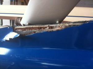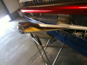 They were hauling ass and there was no way the cox could have heard me. I had just enough time to take one hard stroke with my starboard oar and then another quick short stroke with both. Just as I was doing that second short stroke, WHAM!!! the eight hit my boat at an angle, just about where my foot stretchers are. Busted the Van Dusen wing rigger in half, tore the gunnel up pretty badly, and sent me into the river, which was cold but only thigh-deep, as I was on the sandbar.